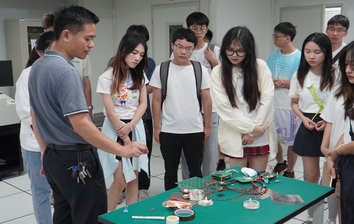 7月13日上午,实践队伍走进华中师范大学物理科学与技术公司,在王东老师的带领下参观了硅像素实验室、粒子探测实验室等实验平台,并聆听孙向明等3位老师分别介绍高速数据传输芯片、高速模数转换芯片和用于X射线偏振探测的芯片,老师们详细解释了芯片的工作原理、制造工艺和应用领域。在集体讨论和答疑环节中,同学们积极提问和交流,不断扩展自己的思维和知识面。
