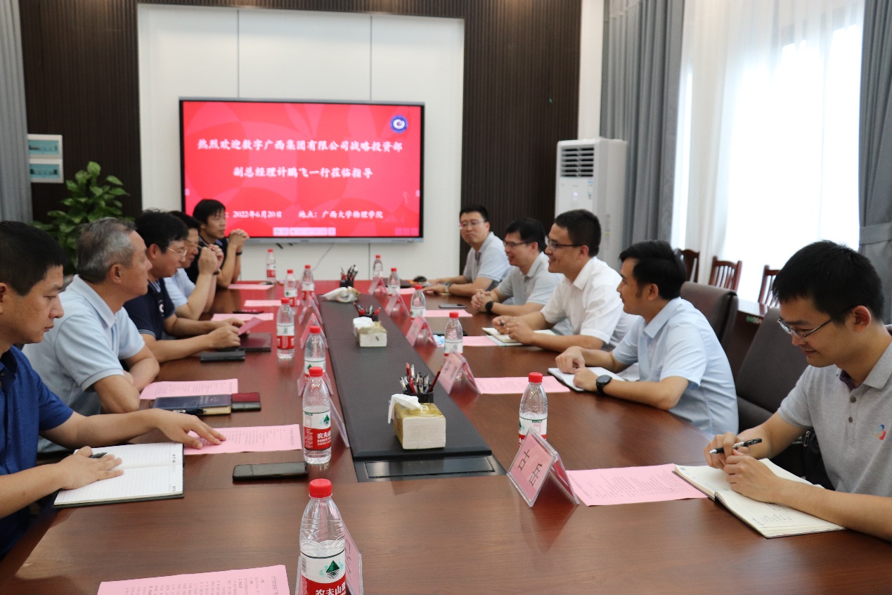 2022年6月20日下午,数字广西集团有限公司战略投资部副总经理计鹏飞一行到公司考察调研,先后参观了洁净实验室、蓝色能源实验室、空间粒子探测实验室。校企双方随后举行座谈会,王祥高常务副经理主持会议。
