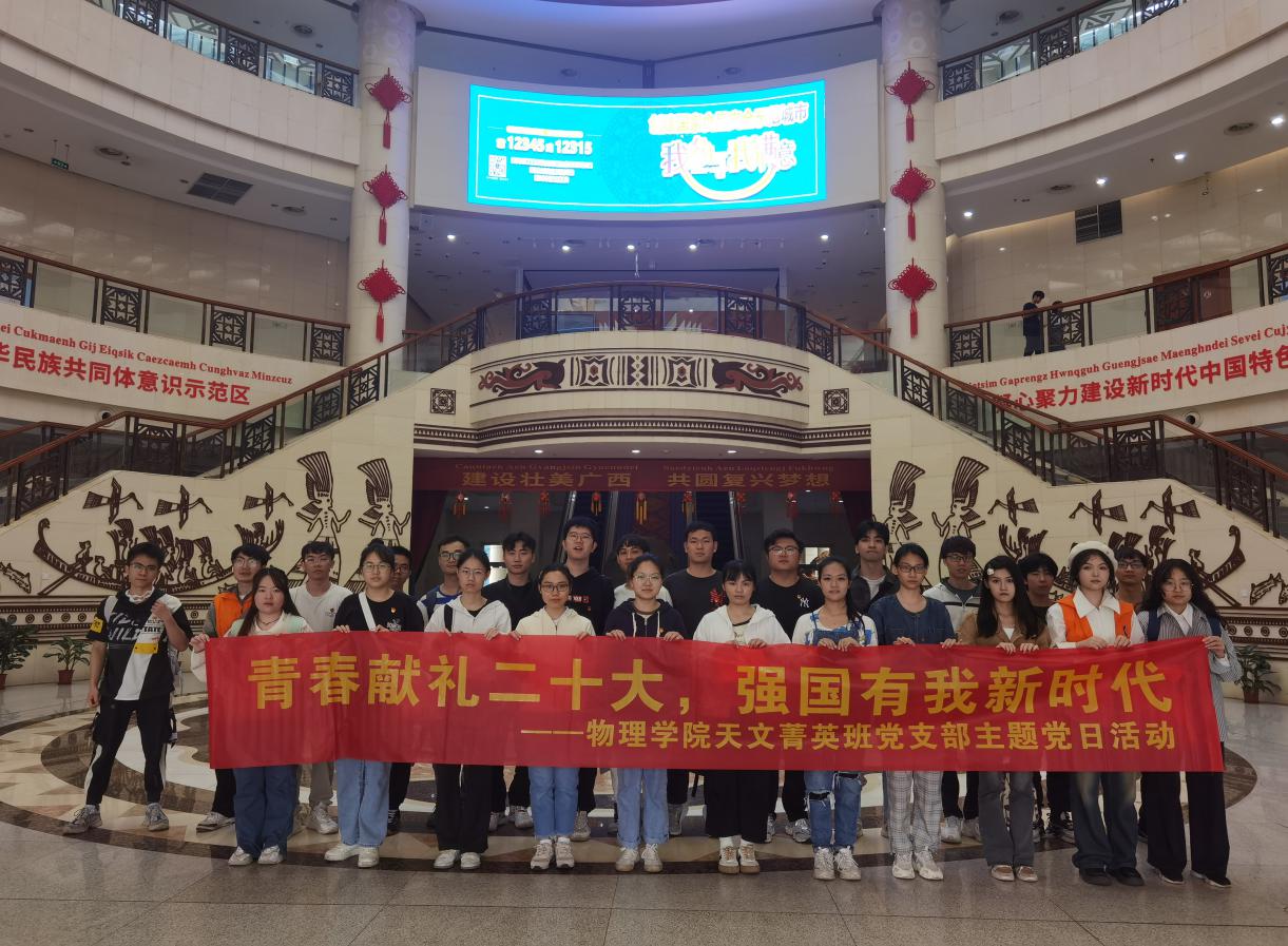 为学习贯彻党的二十大精神,筑牢民族团结奋斗的思想基础,进一步提高员工党员的使命感和责任感,更好地发挥党支部的战斗堡垒作用和党员的先锋模范作用,公司天文菁英班党支部于4月2日赴南宁市青秀山、广西民族博物馆开展“青春献礼二十大,强国有我新征程”主题党日活动。