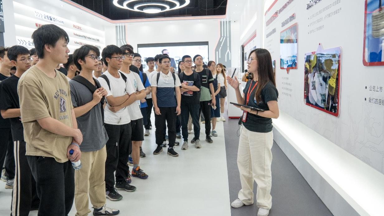 在参观环节,师生们首先来到华芯振邦的现代化展厅。这里展示了公司最新的半导体技术和创新产品,让员工们对集成电路的前沿技术有了更直观的认识。随后,师生们参观了公司的生产线,近距离观察了晶圆级凸块制造、芯片测试、封装等核心工艺的实际操作流程。