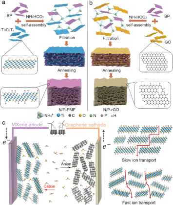 采用一步气体辅助发泡法设计并制备了具有氮、磷端子的多孔MXene 薄膜。通过选择性蚀刻Ti3AlC2获得少层 Ti3C2TxMXene 纳米片,并且使用球磨和超声分散法从块体黑磷中剥离出黑磷纳米片(BP)。然后,通过纳米片和铵离子之间的静电相互作用,将 MXene 和 BP 纳米片在碳酸氢铵(NH4HCO3)溶液中进行自组装。利用真空过滤收集复合膜,并在高温热处理后获得具有含氮、磷端子的多孔MXene膜(N/P-PMF)。在热处理过程中,NH4HCO3分解释放出的NH3和CO2气体在薄膜内构成了一个三维互联的多孔结构,并且NH4HCO3能够作为氮源实现对MXene的N掺杂。同时,BP能与MXene表面官能团反应并导致-OP端子的形成。并且,通过使用同样的方法,也能够制备出具有氮磷端子的多孔石墨烯薄膜(N/P-rGO)。