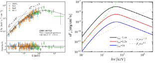 来研究伽玛暴的瞬时辐射谱。通过具体分析,本工作的研究者发现这可能不符合实际物理过程,特别是波印廷能流主导的喷流中。鉴于此,他们研究了含时电子注入率情况下的同步辐射谱。结果发现,若电子注入率随时间变化的速度足够快,人们就能够观测到类似伽玛暴瞬时辐射的能谱。以下是伽玛暴GRB 180720的观测数据(左图,取自[2])和我们文章中的结果(下图):