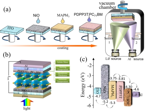 Fig. 1. (a) Schematic diagram of the MAPbI3/PDPP3T:PC71BM composite thin-film photodetector fabrication process. Structure diagram (b) and energy level diagram (c) of the composite thin film photodetector.
