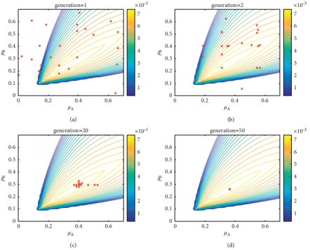 图中显示了遗传算法优化原理。优化目的是找出最佳的Alices诱骗态强度μA和Bob诱骗态强度μB。红点表示每一代的候选子代。(a)表示在第一代中,候选子代随机在搜索空间产生可能的解决方案。(b)和(c)表示经过交叉、变异操作产生更优子代。(d) 50代后,算法在接近最优点停止。