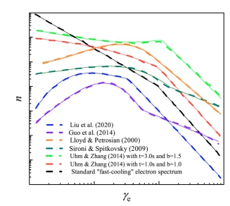 高能电子的同步辐射是最有希望解释伽玛暴瞬时辐射阶段辐射能谱非热特性的物理模型之一。在同步辐射框架下,辐射能谱的形态主要由电子能谱决定,而后者与相对论喷流中的能量耗散与粒子加速过程息息相关。因此,研究伽玛暴瞬时辐射阶段的电子能谱对研究相对论喷流物理有着重要意义。