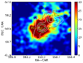 有证据表明年轻的巨星团可能是银河系内高能宇宙线起源之一。公司硕士研究生葛婷婷和导师孙晓娜与中国科技大学杨睿智教授等合作,基于Fermi卫星的高能粒子探测器LAT最新的观测数据,研究船底座星云复合体中大质量星团Tr 14和Tr 16周围GeV伽马射线辐射,发现这个区域存在扩散的GeV伽马射线辐射,其空间分布与分子气体一致,用两个高斯盘的空间模型可以很好地解释。两个区域的伽马射线能谱分布均可用轻子和强子两种模型去拟合。区域A的谱较软且显示了一个明显的pion-bump特征,可能是由于A区的双星系统过亮引起,或是双星系统加速的软宇宙线和气体相互作用导致,但也不排除双星系统和大质量星团共同加速宇宙线的情况。B区的高气体密度和伽马射线辐射与分子气体之间较好有空间一致性,其伽玛射线辐射可能起源于强子辐射。两个区域的宇宙线径向分布不符合1/r的关系,可能由于该系统中的宇宙线是来自最近的一些脉冲过程,而不是持续注入的。