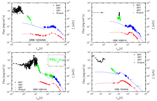 本工作研究了不同观测角度下结构化喷流的正向外激波,暴周环境为星风-均匀激波化星风。研究发现:在观测视角较大时(偏轴观测),利用该模型可以产生上述的现象;在观测视角较小时(正轴观测),在特定条件下也会出现具有上述特征的鼓包。我们寻找Swift卫星观测数据、及公布的一些光学数据,找到具有类似余辉的伽玛暴有:GRB 120326A、GRB 100901A、GRB 100814A、GRB 120404A。基于马尔科夫链蒙特卡罗方法,我们对这些暴进行模型拟合,拟合结果如下。可以看出,我们的模型能够很好地解释这些晚期特殊鼓包。