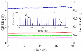图二 误比特率(QBER)和计数(Counts)48小时稳定性测试。绿色(粉色)线表示X(Z)