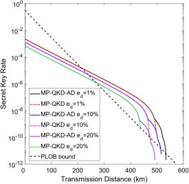 的情况下,本研究方案的通信距离相较于原始MP-QKD方案提升了40 km;同时,该方案所能容忍的量子比特错误率几乎是原始MP-QKD方案的两倍。此外,如图2所示,在失配错误越大的情况下,该方案所能提升的通信距离相较于原始MP-QKD方案越远。该研究有效地促进了MP-QKD在高损耗、高失配错误的场景下的应用。