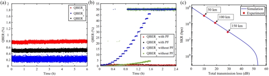 研究团队通过搭建了一套基于硅基集成芯片的BB84-QKD实验系统对该资源节约型方案开展测试(如图1所示)。实验结果表明,在无任何主动反馈的情况下该方案可以在连续6小时的时间内保持0.5±0.02%的低量子比特错误率(QBER),验证了该方案的稳定性(如图2. (a)所示);此外,采用自研高速反馈算法,该方案成功实现了光纤偏振漂移的自动补偿,验证了该方案的可行性(如图2. (b)所示);最后,成功在150 km的商用光纤链路上获得了866 bps的安全密钥率(如图2. (c)所示)。