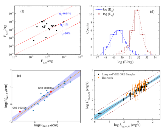 伽马射线暴(伽马暴,GRB)早期光学余辉光变曲线的onset特征是薄壳层情景标准外激波模型下的理论预测结果,公司博士生张璐璐与导师梁恩维教授合作在伽马暴余辉光变的样本分析研究中取得进展。通过收集整理Swift卫星发射以来的光学和X射线余辉的观测数据,选择了早期光学光变曲线呈现明显标准光变曲线特征的30个伽马暴样本。基于标准正向外激波型、采用贝叶斯推断方法,我们拟合了这些样本的光学和X射线余辉观测数据,给出相关物理参数的后验分布,计算了与喷流相关的物理量。研究发现,该样本的瞬时辐射效率分布范围为0.04%-10%,与物质主导喷流模型预测的低辐射效率一致。经几何修正后,瞬时辐射能量和喷流动能均表现为比较紧凑的正态分布,与前人提出的伽马暴喷流具有标准能量库的假设相吻合。特别地,研究发现火球减速半径(Rdec)、初始磁场强度(B0)以及磁场和电子的能量分配比例参数σB(σB=εB/εe)之间存在紧凑的依赖关系Rrdec,17=101.00±0.05B0-0.83±0.06σB0.26±0.02,该关系推断不同样本的喷流中电子所携带的能量占比基本一致。该样本同典型的长伽玛暴在3σ置信度水平内同样遵循Lγ,iso − Ep,z − Γ0三参量关系。本研究成果已被《The Astrophysical Journal》杂志接受发表。