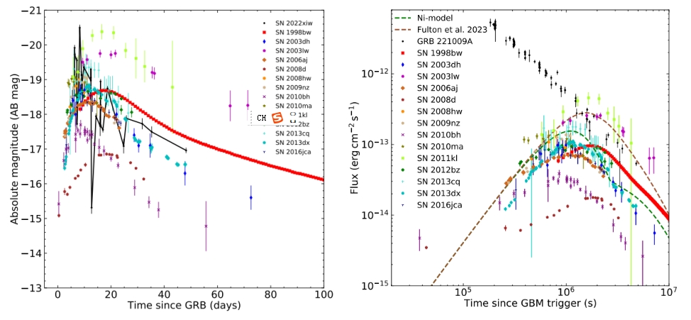 伽马暴与超新星之间的关系已经被确立二十几年了,但是伽马暴与超新星成协的物理性质依旧没有得到很好的研究。2022年10月9号13:16:59.000 UT,GBM触发伽马暴GRB 221009A。就流量而言,GRB 221009A是目前观测到的最亮的伽马暴,而且红移小 z =0.151。所以,对于伽马暴GRB 221009A是否与超新星SN 2022xiw成协也是被广泛讨论。LCOGT、GWAC-F60、KAIT和Nickel望远镜也对其进行后随观测,我们在R波段获得了良好的光变。我们发现在GRB 221009A被触发 ~ 11天后,其R波段光变显现出一个小鼓包,这可能是一个超新星鼓包。于是,我们用折断幂律函数和56Ni模型拟合R波段光变(见图1)。得到的最好拟合结果:超新星喷射物质量Mej = 3.70 M⊙ , 56Ni的质量MNi = 0.23 M⊙ (这里的M⊙ 是太阳质量), 动能ESN,K = 2.35×1052 erg。我们拿GRB 221009A和其他GRB-SN成协事件比较,在同样的距离下,我们发现在我们的样本中只有SN 2003lw和SN 2011kl可以在GRB 221009A的余辉下被明显观测到(见图2)。其中SN 2003lw的峰值出现得较晚,而SN 2011kl则被认为可能是超亮超新星。所以我们建议GRB 221009A与SN 2022xiw成协,只是SN 2022xiw的辐射很大程度被GRB 221009A的余辉掩盖了。虽然SN 2022xiw很亮,GRB 221009A的余辉相对更亮。