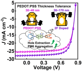 针对以上问题,公司薄膜光伏团队与福建海峡实验室、韩国浦项科技大学合作,选择具有给体-受体-锚定集团的小分子材料2F来修饰PEDOT:PSS,通过提高导电性来克服界面层的膜厚限制。研究证实,2F小分子聚集在了ITO表面,形成了偶极层,从而改善了PEDOT:PSS的聚集方式,提高了电导率、增加了功函数,最终表现出了更好的电荷提取效率以及更低的漏电流密度。因此,2F修饰的PEDOT:PSS界面在基于PM6:Y6作为活性层的有机光伏电池中,实现了17.1%的效率,高于对照组器件的15.7%,效率的提升主要来源于由电荷提取导致的电流密度提高。而且,当进一步将界面层的膜厚提高到170nm后,以2F修饰PEDOT:PSS为界面层器件的效率仍然实现了超过15%的效率,体现了其优异的膜厚容忍性。利用1,3,5-三溴苯作为固体添加剂后,以2F+PEDOT:PSS为界面层的基于PM6:Y6、PM6:BTP-eC9、PM6:L8-BO器件的效率分别达到了18.3%、19.2%和19.1%。该研究揭示了通过小分子策略修饰空穴界面层来提高器件性能的有效性,对于有机光伏电池的产业化应用具有深刻意义。