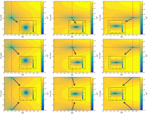 图3. 使用最小化卡方的方法对45°斜入射的模拟数据进行偏振重建的结果。图中包括了对不同偏振度和偏振角入射源进行偏振重建的结果,红色十字表示模拟器中偏振度和偏振角的输入值。子图中黑色、黄色和绿色环分别代表1σ、2σ和3σ置信区间。