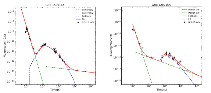 左图:样本X射线光变曲线; 右图:X射线bump峰值时间统计结果