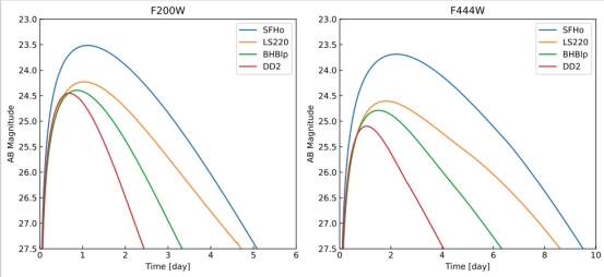 在这项工作中,我们使用来自不同状态方程的天体物理条件作为核合成输入,以探索各种状态方程对快中子捕获过程核合成和千新星发射的影响。我们的结果表明,合并喷射物的元素丰度(图1)和千新星光曲线(图 2)都强烈依赖于中子星状态方程。给定两颗中子星的质量,较软状态方程的合并往往会产生更多的喷射物质,千新星光变曲线越亮,峰值光度越高(图 3)。中子星状态方程与峰值光度之间的关系为在中子星合并的多信使观测中约束状态方程的性质提供了一个探针。
