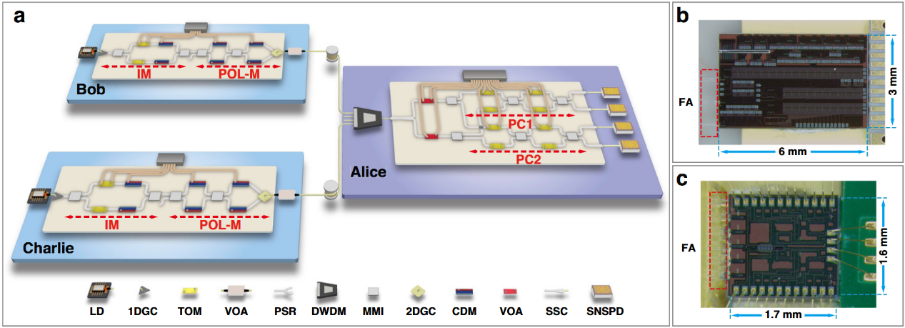 图3: 实验设置。(a) 基于芯片的三节点量子网络。(b) 硅基编码器芯片的显微图。 (c) 硅基解码器芯片的显微图。