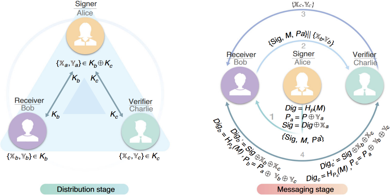 为了提升上述集成QDS网络性能的同时增强其与硅基芯片的兼容性,研究团队还发展了单诱骗态一次全域哈希QDS协议(图2)。该协议的运行主要分为分发阶段和消息阶段,其优势在于:1、不需要制备真空态,从而降低硅基芯片上强度调制器消光比的要求,以此减小发射器芯片制造复杂度;2、在消息阶段可以直接利用未经隐私放大的非完美密钥,因此可以极大的减小数据后处理所需的计算资源,并减小系统延迟。