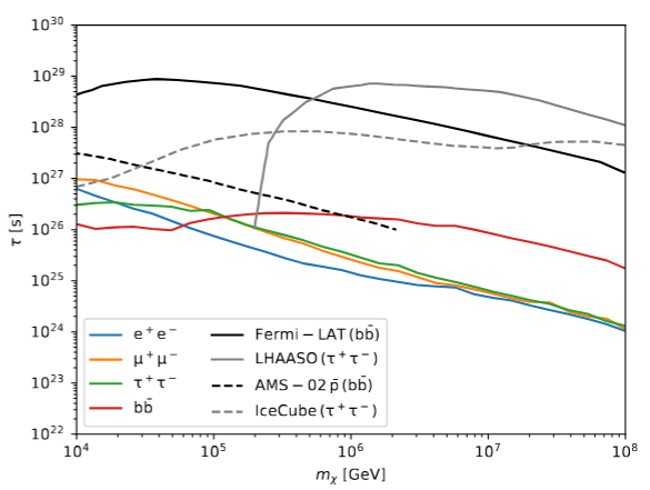 若原初黑洞(PBHs)的霍金辐射受memory burden效应抑制,极小质量的PBHs仍能存活至今,从而打开一个新的质量窗口。PBHs霍金辐射与重暗物质(HDM)衰变均可产生高能电子,本工作基于DAMPE宇宙线电子观测数据,对HDM的衰变寿命和memory-burdened PBHs的暗物质丰度进行限制,并讨论了电子谱高能上升趋势为暗物质成分的可能性。尽管本工作给出的限制均弱于由伽马射线观测所给出的结果,但基于宇宙线电子的限制可对其他结果进行验证和补充。构成DAMPE电子谱上升所需的暗物质参数空间均被现有观测所排除。HDM衰变寿命和memory-burdened PBHs丰度的限制结果分别如下图所示。