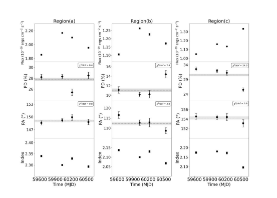 成像X射线偏振探测器IXPE自发射以来对Crab蟹状星云进行空间分辨的X射线偏振探测。我们利用IXPE卫星的观测数据,研究了蟹状星云在两年内空间分辨的偏振变化,并提供了其磁场结构及演化的关键见解。结果显示,在2--8 keV能区的三个感兴趣区域内,偏振度(PD)存在显著的随时间变化。