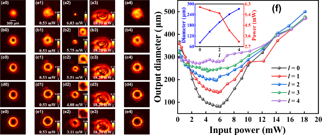 图 1 不同拓扑荷的涡旋光的非线性传输结果。