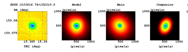 Fig.1: As an example, from left to right, the photometric image from SDSS, the best descriptions to the photometric image by dual-core system, the resolved images for the two cores included in the photometric image.